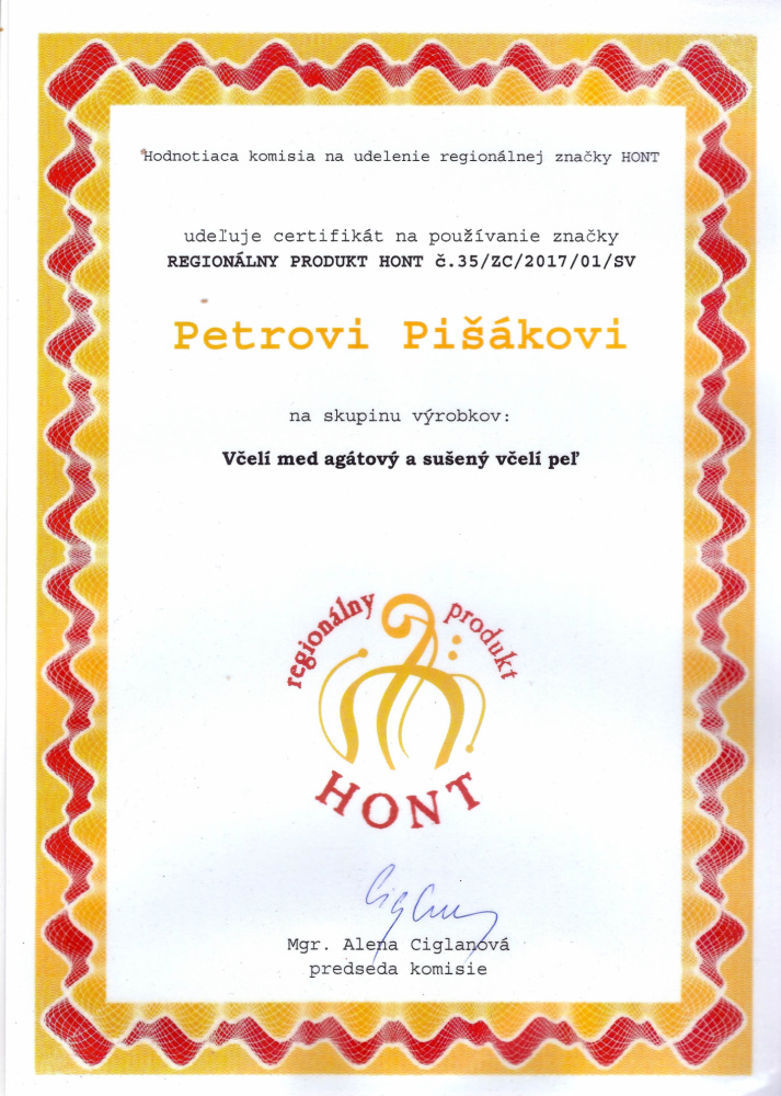 Aktuálne platné osvedčenie pre ochrannú známku Slovenský med pre včelára Petra Pišáka si môžete pozrieť na tomto linku tu Osvedčenie o akosti medu